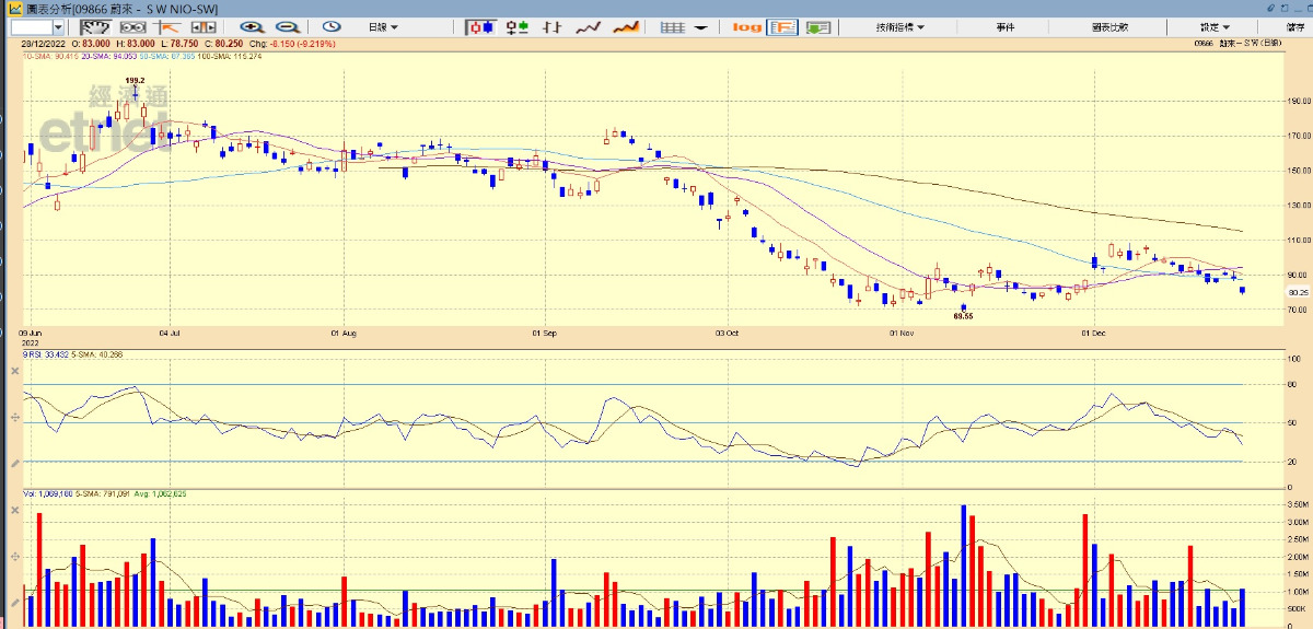 蔚來(09866)預計第四季度將交付3.85萬輛至3.95萬輛汽車,較之前發布的預期4.3萬輛至4.8萬輛有所下降,消息拖累隔晚美股及港股股價一同捱沽。聶振邦指短線操作而言新能源車股絕非最當炒股份,目前於整體約於11月低位徘徊。他指,近期平台股更為當炒,但料政策面上3月之後會再推環保議題,目前低位為不錯買入時機,但要有持貨較長準備。他指蔚來現價80元水平可以吸納,72至75元值博率更高,3至4個月目標重上100至110元水平。
