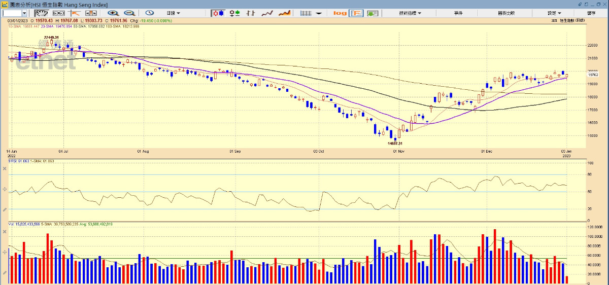 2023年的首個交易日,恒指低開210點,報19570。早段汽車股、濠賭股及餐飲股回升,恒指一度由跌轉升,接近中午收市時更重上2萬點關口。安里控股主席兼行政總裁黃偉康向《經濟通通訊社》表示,內地及香港的確診人數反彈,加上兩個多星期後為農曆新年假期,或讓部分投資者不太積極參與,成交相信不會非常活躍。不過,他指出踏入新一年,基金都會重新部署投資組合,而隨住經濟活動逐步復常,預期今年有較明顯的增力,市場對港股憧憬較大,有望在新年假期後向上突破。