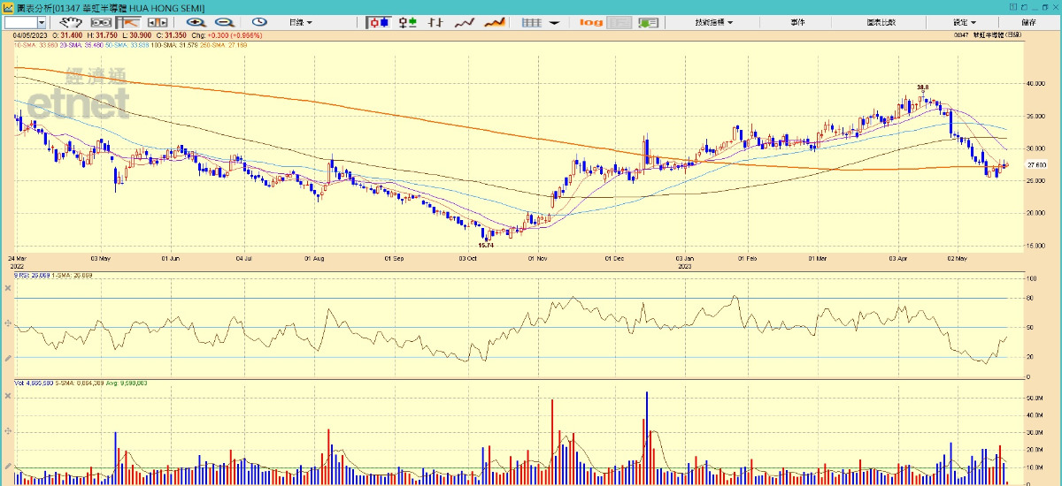 晶片股近期大幅回落,華虹(01347)由上月高位38.8元至本月高位最多回落近35%,近期於250天線上有喘穩跡象。張智威指內地晶片競爭力一向較外國晶片輸蝕,始終技術有差距,難做精細晶片,故政策利好作用消化後便要面臨調整。他指,華虹去年12月低見24.6元後有見支持並反彈,想撈底宜待回落至25元以下才考慮。