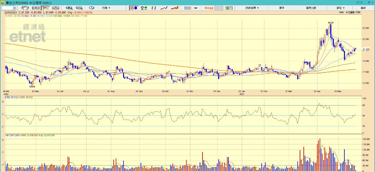 中芯自5月9日低見19元後持續回升,早段曾高見21.45元。(經濟通HV2報價系統截圖)