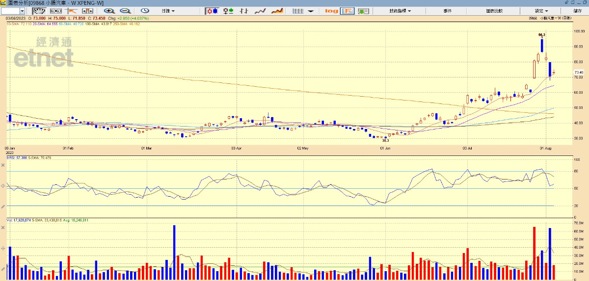 至於早前受大眾汽車入股消息刺激急升的小鵬,高見96.32後大幅回吐,昨日觸及10天線後今日有反彈,聶振邦指現價起計於80元會有一定阻力,短線炒作宜於72元以下部署。但他提到,小鵬最新公布每月銷量表現平平,而且早前低位計大升兩倍,料或有較深調整,短炒入手要小心。