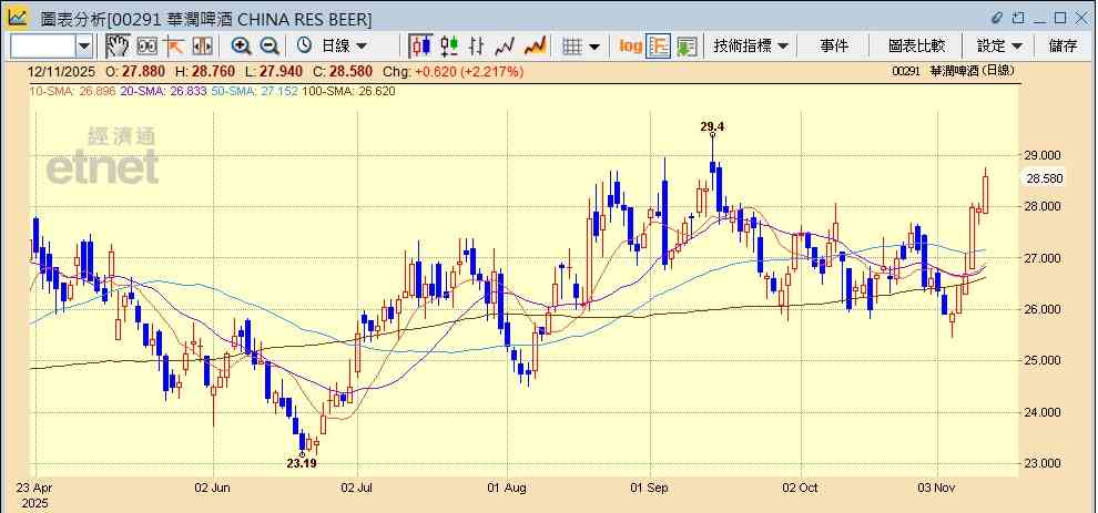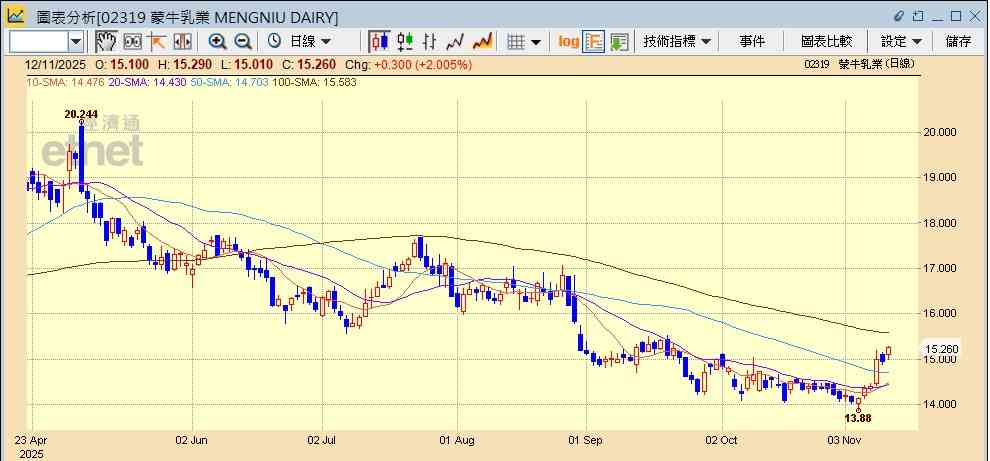 溫鋼城續指,當中蒙牛乳業(02319)及華潤飲料(02460)最落後,近兩三日才起步,啤酒股也已升了幾日,若想吸納可揀潤啤加蒙牛。蒙牛已升穿了50天線,短期先看能否升到早前裂口約15.8元,若升穿該處,下一步可上望約17.5元,預期公司今年盈利增長不錯,預測市盈率只有10倍不算貴。另外,燒烤火鍋通常冬天特別流行,內地民眾於啤酒方面可能會有多些消費,潤啤已升了一輪,短期先看能否衝破近期橫行區頂約30元,若再升可上望35元,預期潤啤今年盈利增長有27%,即預測市盈率僅13.6倍,比過往5年均值達30倍,估值仍嚴重偏低,正好炒作追落後。