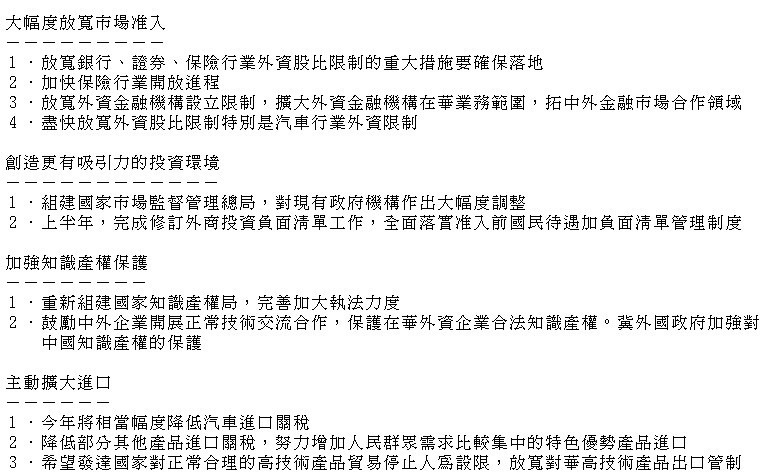 市場高度關注的中國擴大開放重大舉措,今早(10日)由國家主席習近平在博鰲亞洲論壇開幕式上正式公布,內容包括四大方面,涵蓋金融業、汽車業等。