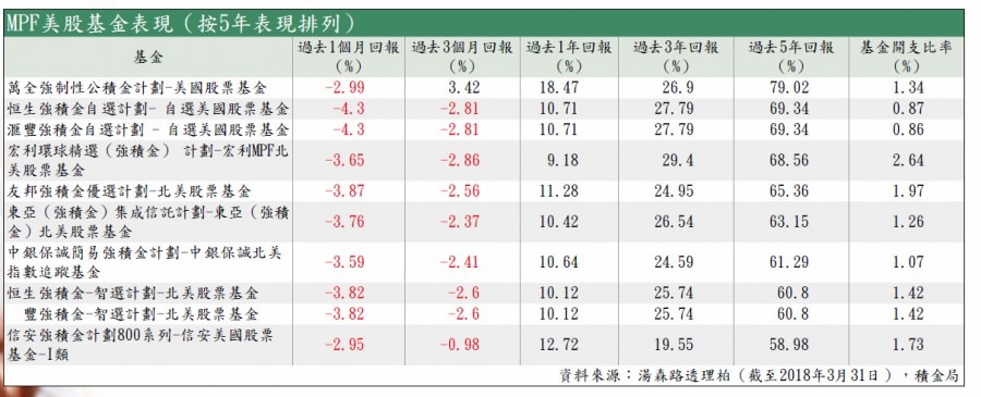 美國股市自2009年展開大升市,道瓊斯工業平均指數由該年3月6600多點低位,上升至早前最高26000點水平,升了3倍。以科技股為主納斯達克指數近由2009年約1300點,升至早前最高的7500多點,上升了差不多5倍。若過去5年(截至2018年3月31日)投資在美股基金,最佳一隻可賺79%,最少亦賺約59%,相當不錯。惟近年美股升幅放緩,過去一年計賺幅介乎18%至9%,遠遜港股。不過,誠如黃國英所言,MPF是長線投資,若相信美國公司可繼續創造更大價值,短期落後或可不太介懷。