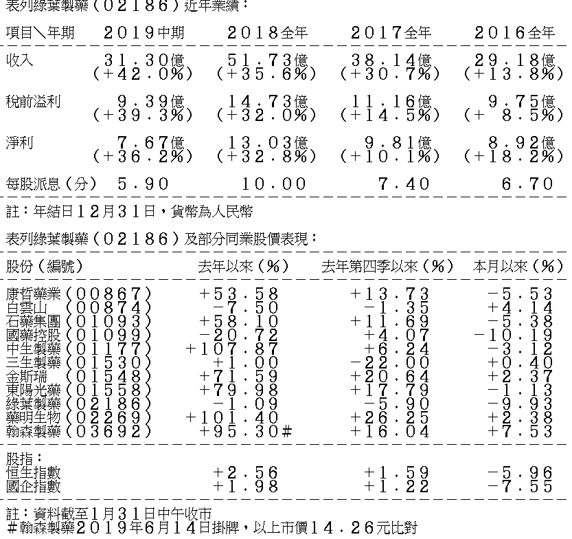 綠葉製藥的產品具有領先的市場地位,2019年上半年增長不俗(CNS資料圖片)